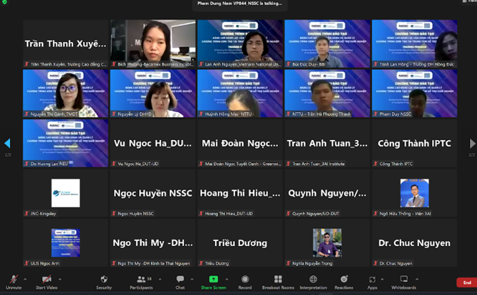Thực hiện các hoạt động nhằm hướng tới phát triển các Trung tâm hỗ trợ khởi nghiệp, từ 06/4/2023 đến 25/5/2023 Trung tâm hỗ trợ khởi nghiệp sáng tạo quốc gia (NSSC) với sự đồng hành của các đối tác quốc tế tổ chức chương trình đào tạo Nâng cao năng lực vận hành và quản lý chương trình ươm tạo tại Trung tâm hỗ trợ khởi nghiệp. Chương trình nằm trong khuôn khổ Đề án “Hỗ trợ hệ sinh thái khởi nghiệp đổi mới sáng tạo quốc gia đến năm 2025”