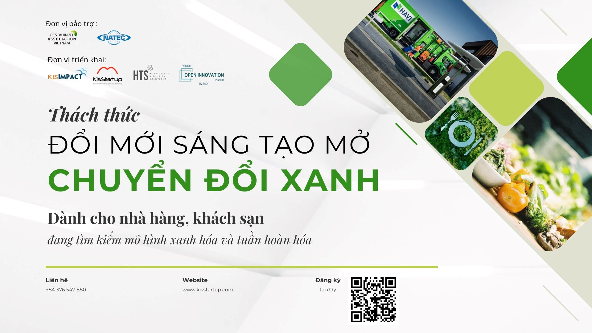 Để hỗ trợ các doanh nghiệp trong quá trình “xanh hóa”, chương trình Thách thức Đổi mới sáng tạo mở chuyển đổi xanh dành cho Nhà hàng, Khách sạn được tổ chức với sự hợp tác chặt chẽ của 06 bên: KisStartup; KisImpact; NATEC- Cục Phát triển thị trường và doanh nghiệp Khoa học và Công nghệ; Hiệp hội Nhà hàng Việt Nam (Restaurant Association of Vietnam – RAV), Nền tảng đổi mới sáng tạo mở được vận hành bởi Công ty cổ phần TAO, Hospitality & Tourism Solutions (HTS Group).